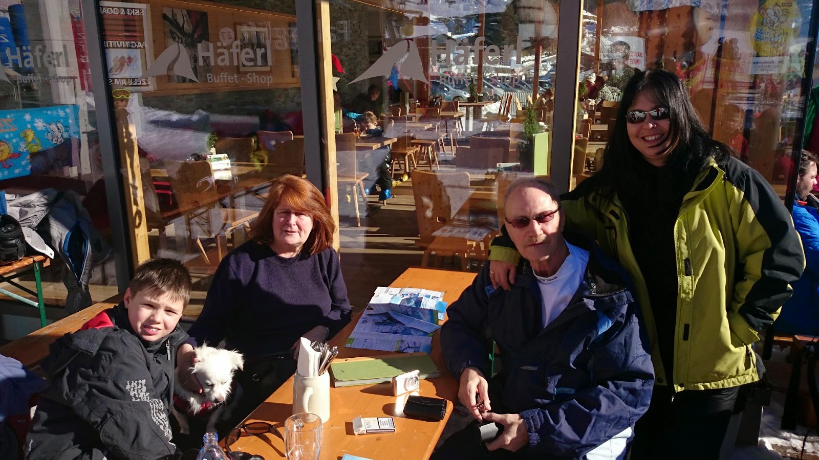 Ma is gyonyoruen sutott a nap, meg tobbet sieltunk mint tegnap - 26.5 kilometert a nap folyaman. Az egyik fekete palya aljan van egy hosszu lankas resz - ott sikerult 93.6 kmh-t elereni, mig a Dabi 57.6-ot, nagyon elvezte :) Ebedelni most egy masik etterembe alltunk meg, a kilatas innen is gyonyoru volt - Dani egy kis adag besciszeletet evett, de elegge gyorsan ette meg hogy ujbol mehessunk sielni. Holnap Charlespapa is jon sielni velunk :)